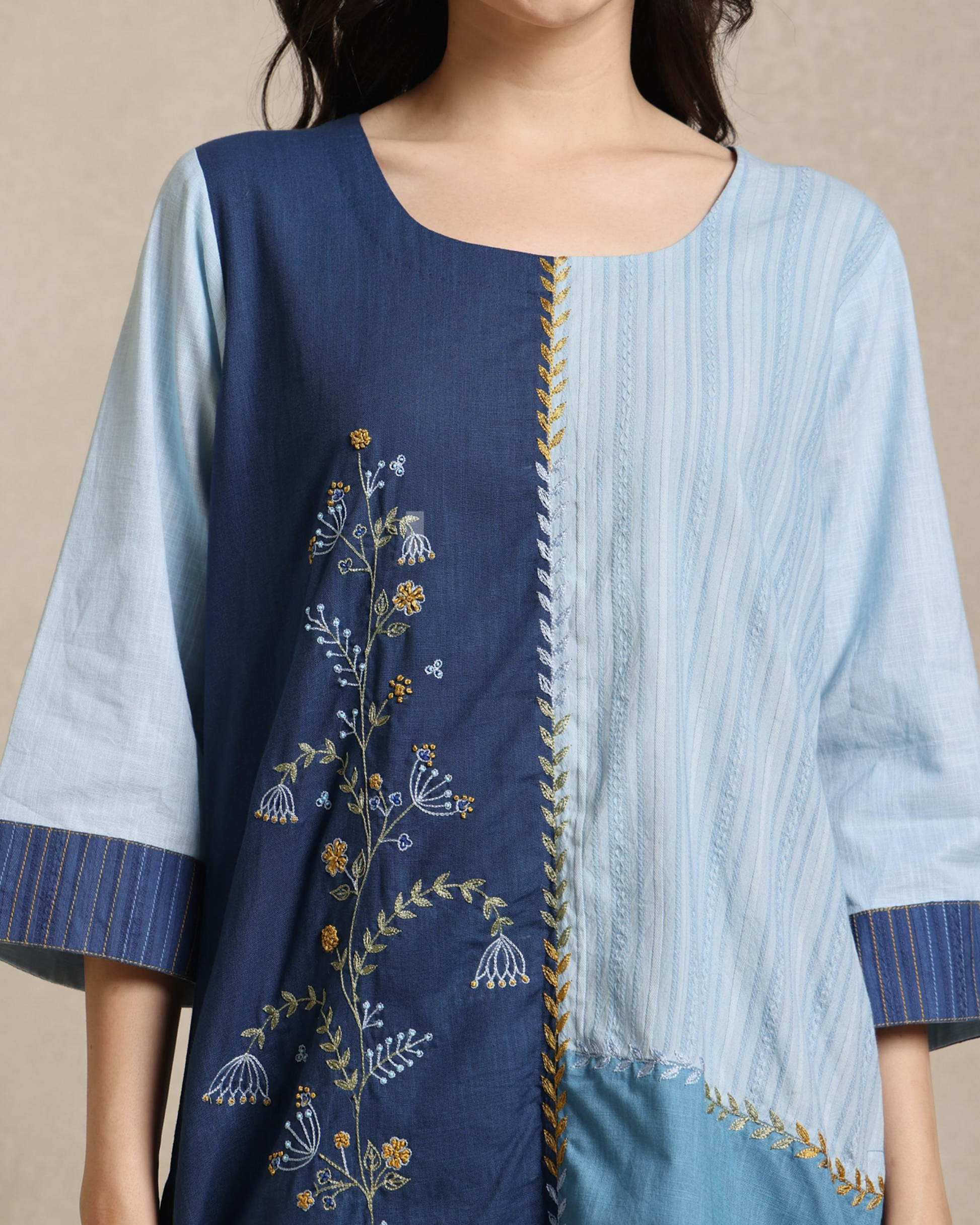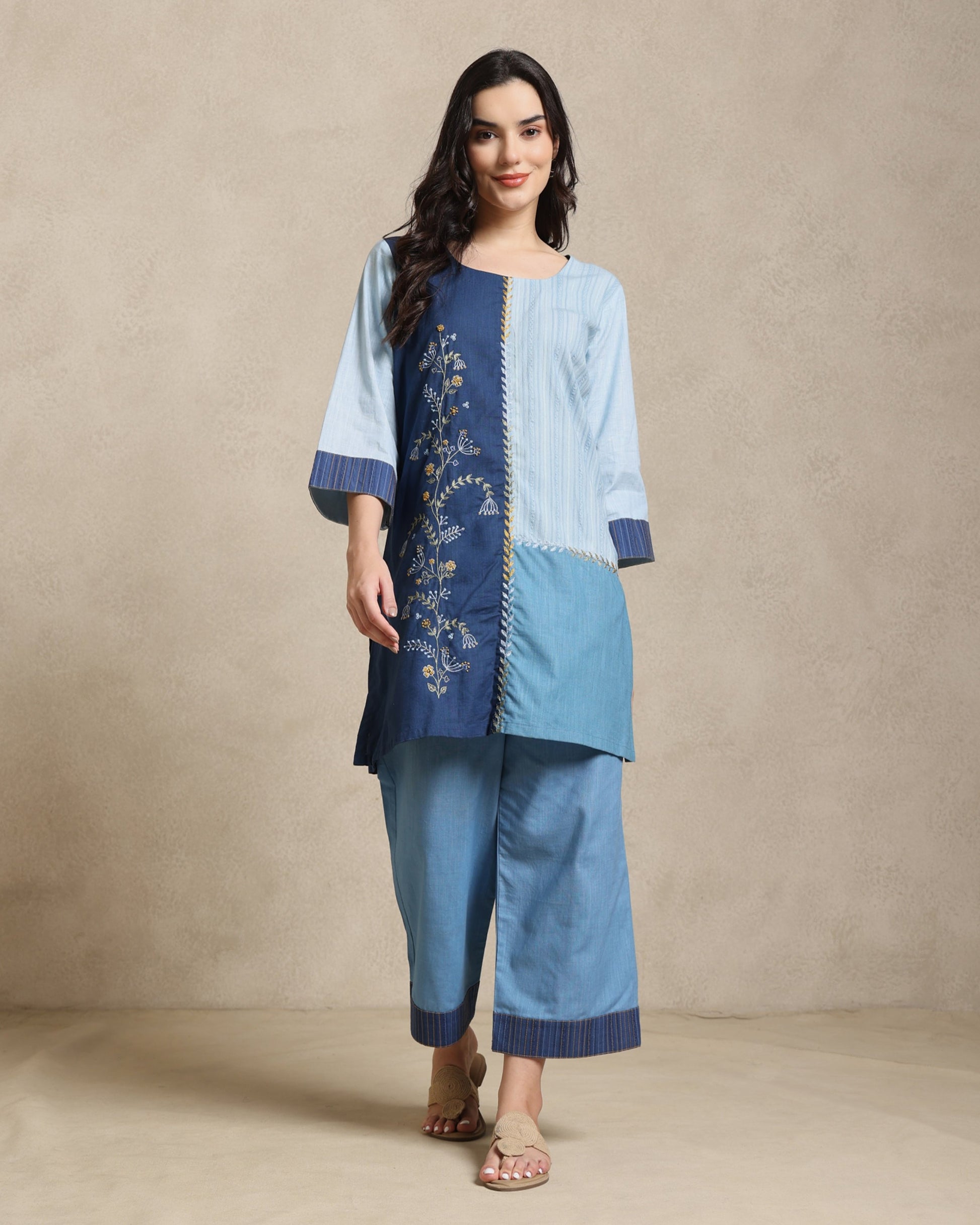 Crafted in breathable slub cotton, this coordinated set is designed for relaxed summer days with a touch of handcrafted charm. The lightweight fabric feels soft and airy on the skin, making it ideal for all-day wear in warm weather. A thoughtfully placed hand-embroidered panel adds delicate detail without overwhelming the silhouette, while the interplay of powder blue, slate blue, and deep indigo creates a calming yet visually rich palette