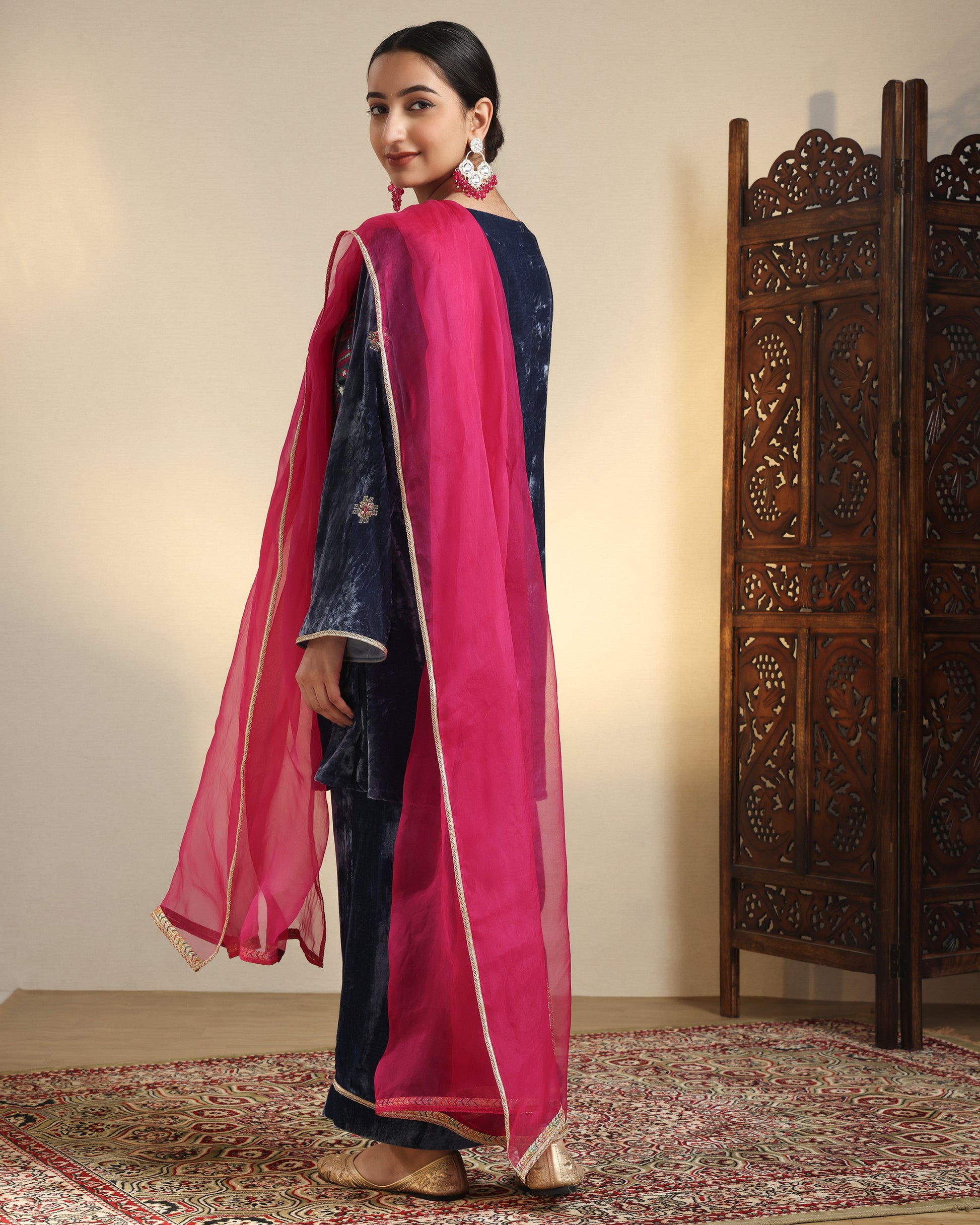 An elegant navy velvet kurta set adorned with intricate hand embroidery and a striking brocade patchwork yoke. The kurta features subtle floral motifs scattered across the fabric, adding depth and charm to its plush texture. Paired with coordinated velvet pants and a contrasting fuchsia silk organza dupatta, finished with delicate borders — this ensemble beautifully balances tradition and modern sophistication.