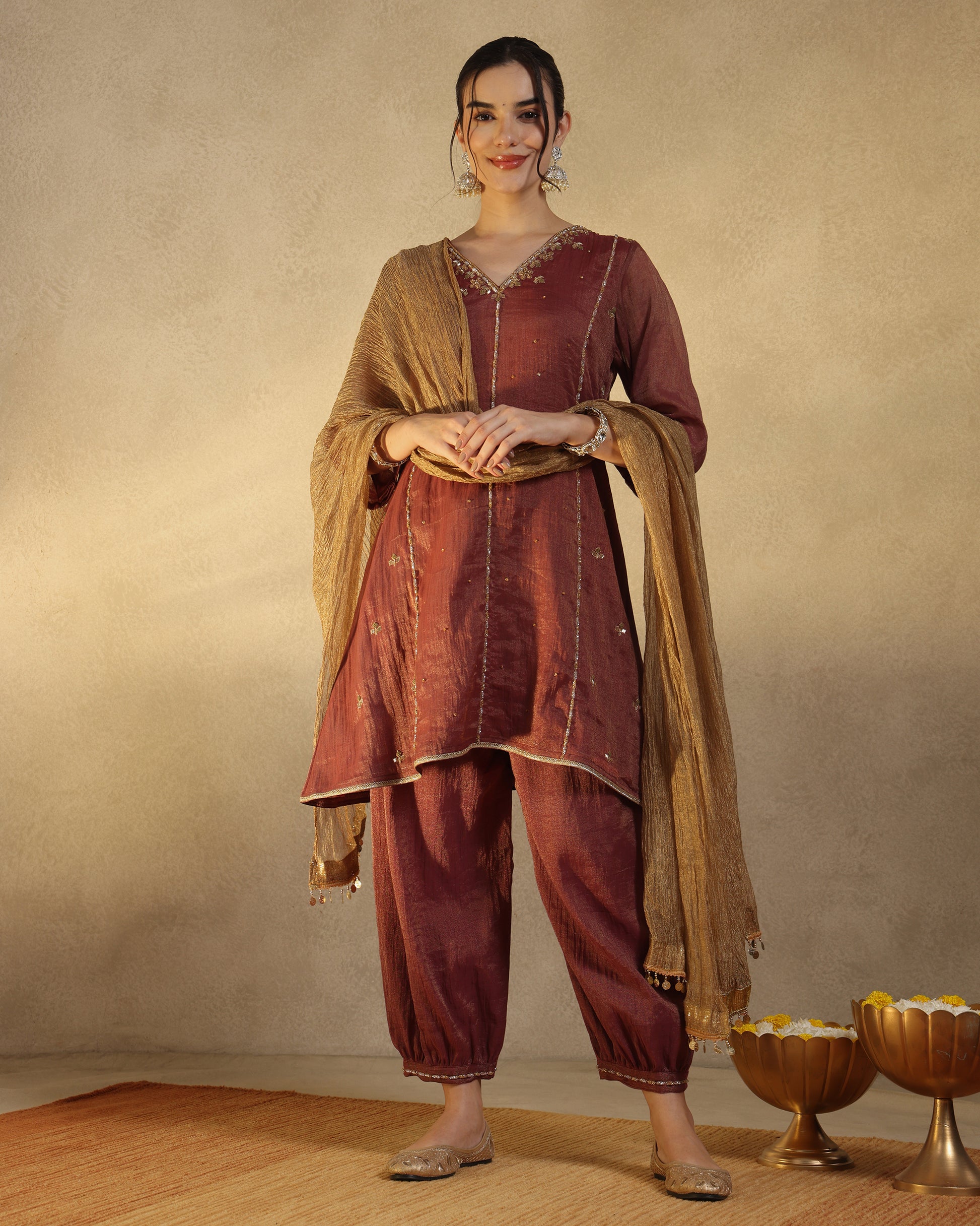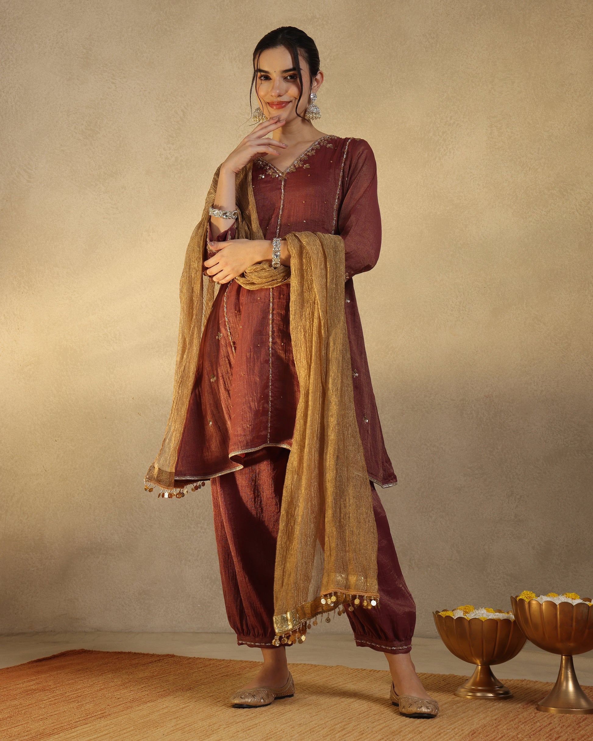 An exquisite kurta set crafted from luxurious Chanderi tissue, paired with matching afghani salwar and a crushed tissue dupatta. The ensemble is lined with soft cotton for comfort. The kurta features intricate hand embroidery adorned with sequins, cut dana, resham, and zari work, lending it a subtle shimmer and timeless grace. Perfect for festive occasions and elegant evenings.