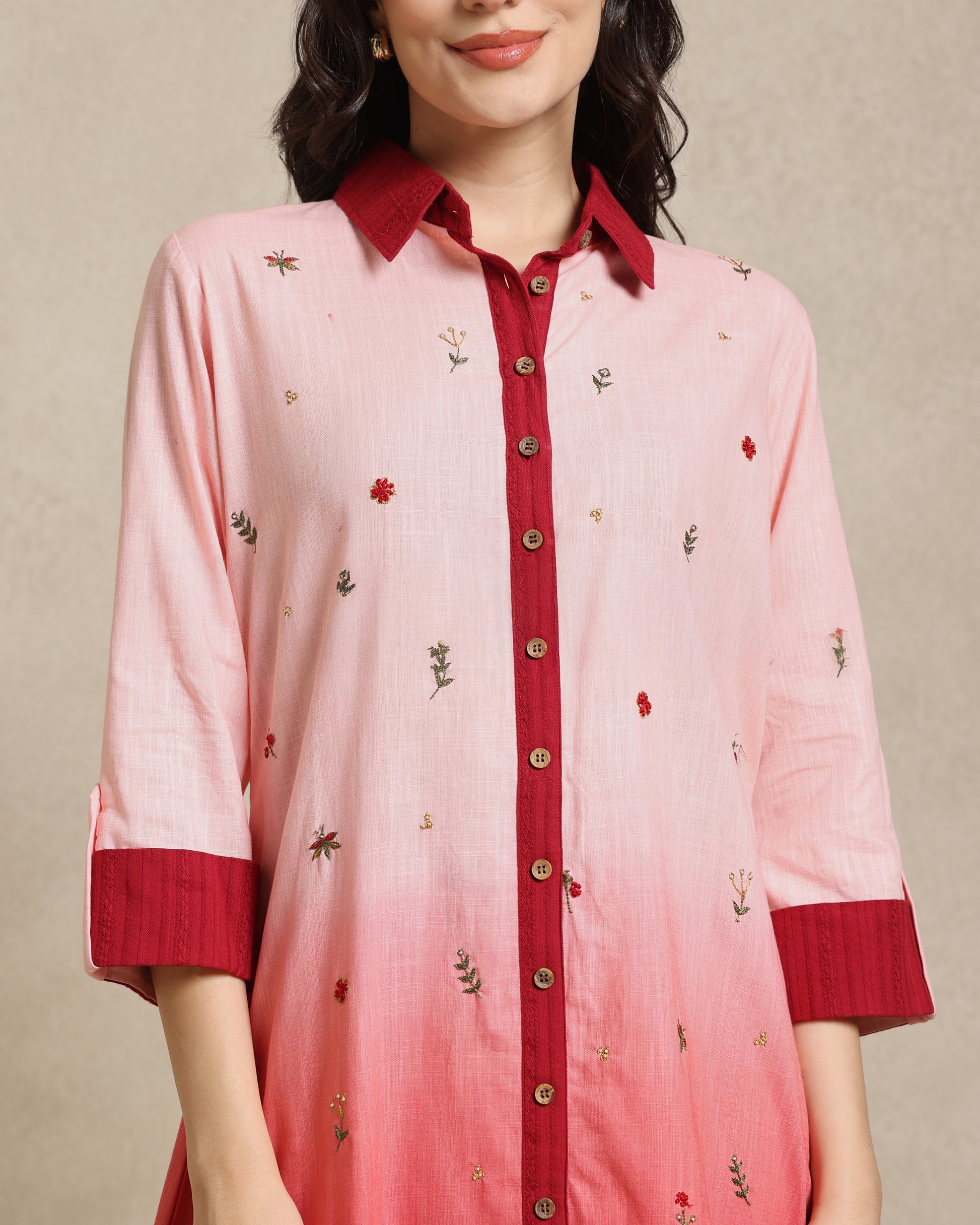 Crafted in breathable slub cotton, this ombré dress is designed for easy summer comfort with a touch of handcrafted detail. The lightweight, textured fabric feels soft and airy on the skin, while delicate hand embroidery scattered across the surface adds subtle charm. The ombré palette flows beautifully from soft blush pink to deep crimson red, creating warmth and depth while remaining effortless to wear. Finished with a relaxed button-down silhouette and a gently gathered hem for ease of movement, this piece keeps you cool, comfortable, and quietly elegant through warm days.