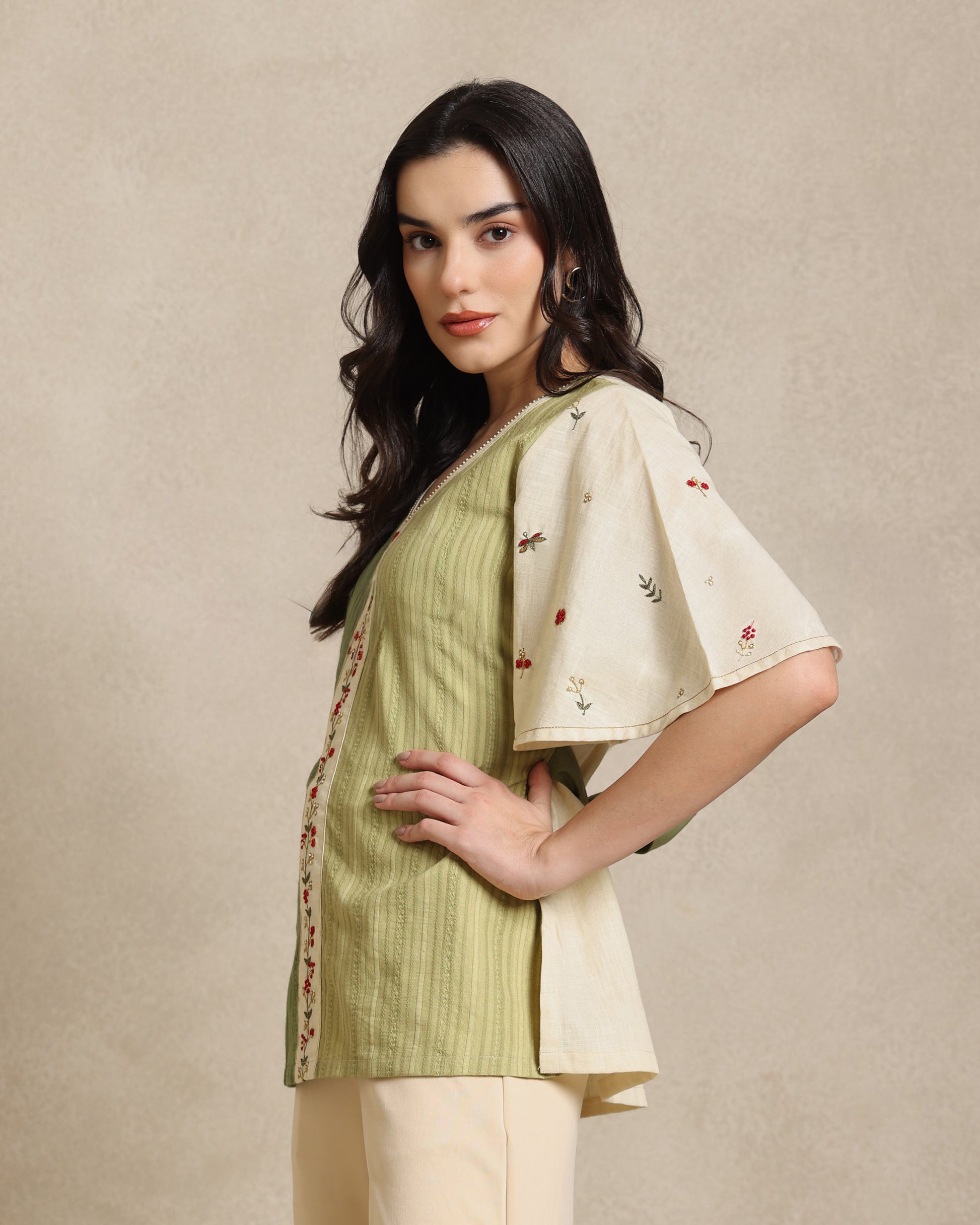 Crafted in breathable slub cotton, this top is designed for effortless summer comfort. The naturally textured fabric feels light and airy on the skin, while the hand-embroidered front panel adds a delicate touch of craftsmanship without any heaviness. Soft shades of pistachio green and muted olive blend seamlessly with a warm ivory base, creating a calm yet refined palette. Finished with easy bell sleeves for added movement and ventilation, this piece is perfect for staying cool, comfortable, and quietly elegant through the season.