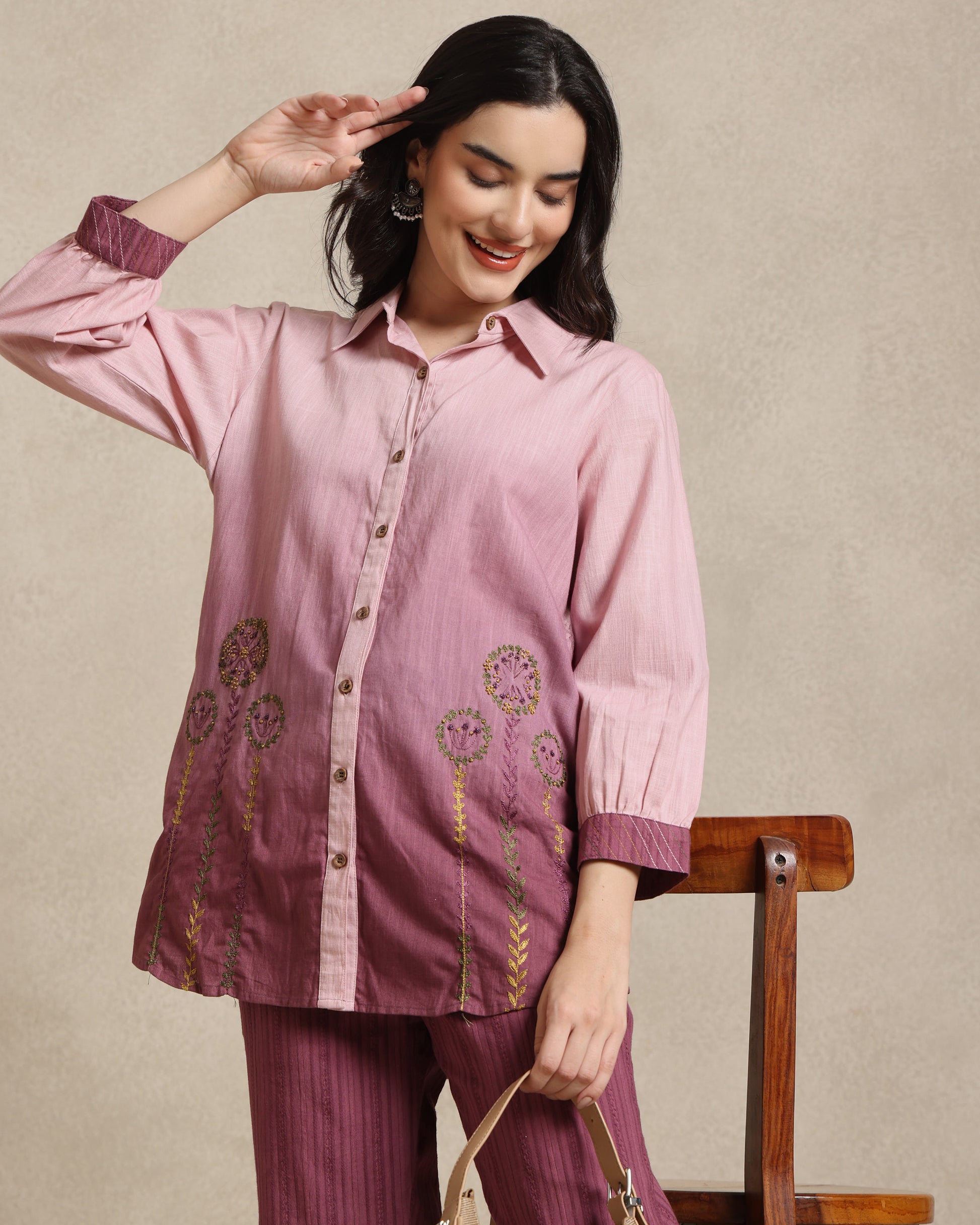 A modern take on everyday elegance, this coord set is crafted in breathable slub cotton and finished with a soft ombre dye that adds depth and warmth to the palette. Delicate hand embroidery accents the silhouette, bringing a subtle artisanal charm, while the thoughtful color-blocking technique creates visual balance and structure. Designed for comfort and effortless movement, it’s a versatile ensemble that transitions seamlessly from relaxed daywear to understated festive moments.
