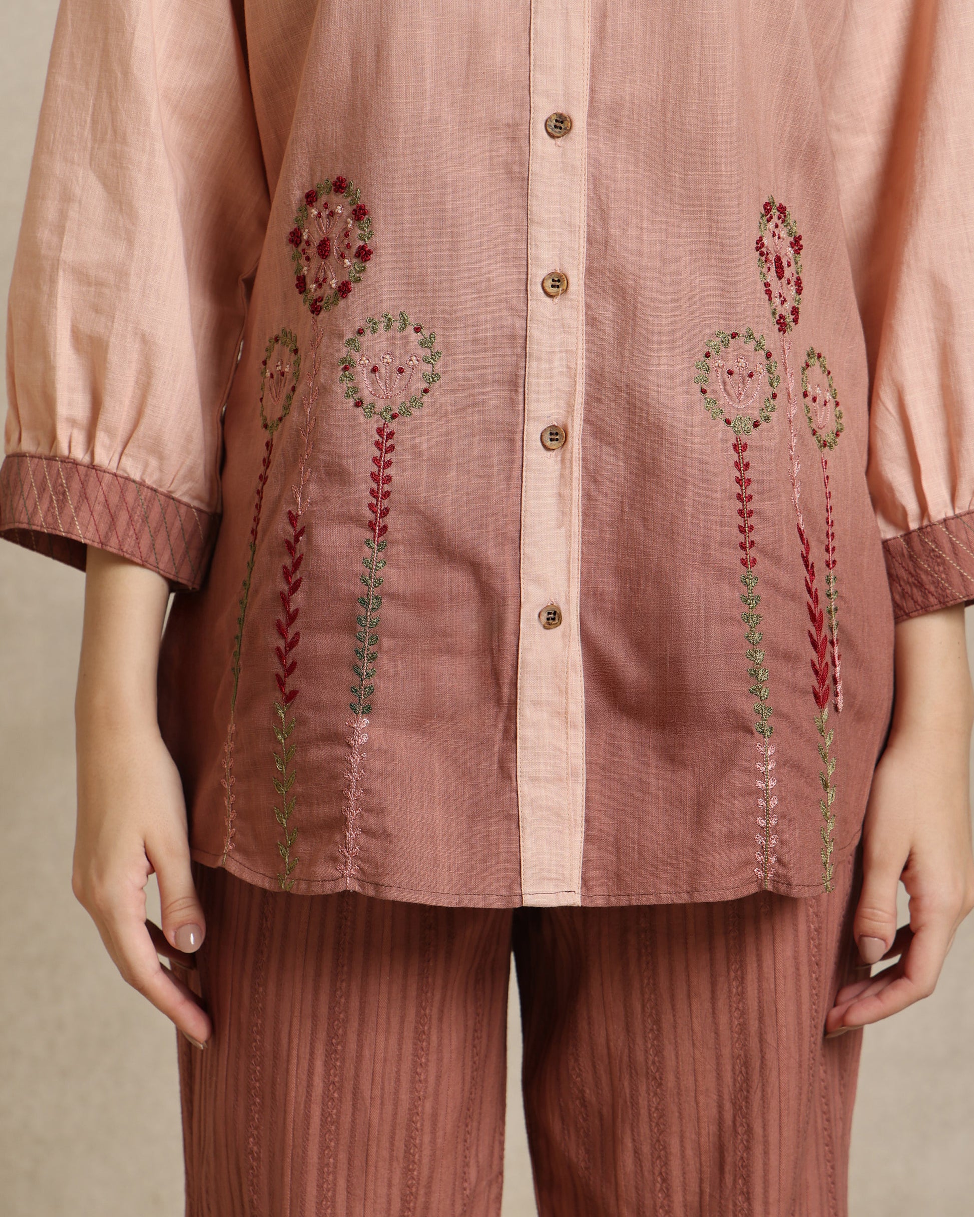 A modern take on everyday elegance, this coord set is crafted in breathable slub cotton and finished with a soft ombre dye that adds depth and warmth to the palette. Delicate hand embroidery accents the silhouette, bringing a subtle artisanal charm, while the thoughtful color-blocking technique creates visual balance and structure. Designed for comfort and effortless movement, it’s a versatile ensemble that transitions seamlessly from relaxed daywear to understated festive moments.